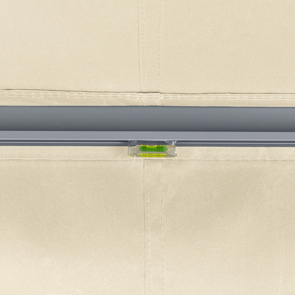 The awning can be opened as much or as little as you like up to the maximum projection. The specially designed elliptical arms are adjustable to enable you to alter the slope of the awning from almost horizontal to a relatively steep tilt of approximately 45 degrees from the horizontal. The aluminium front bar ensures the fabric hangs smoothly.