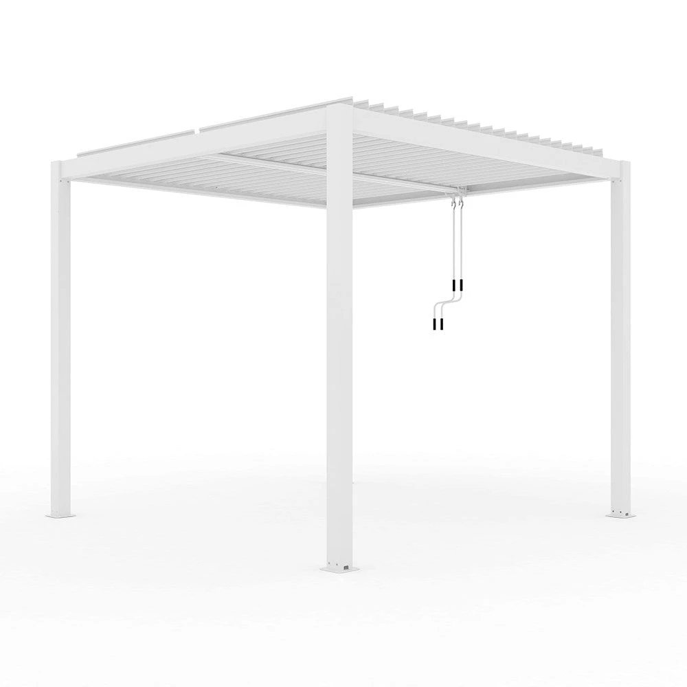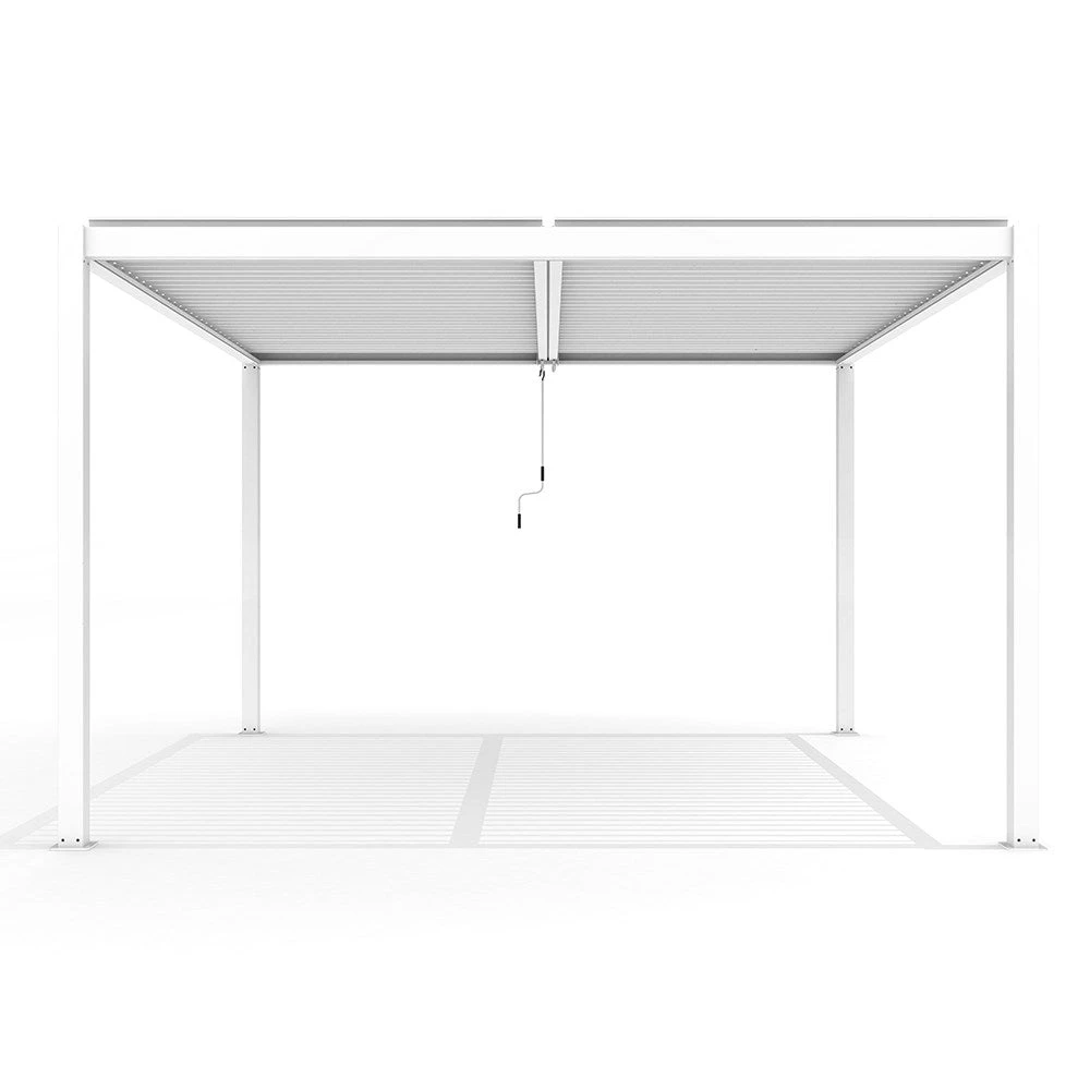 The adjustable hand-cranked louvered shutter roof is a practical way to let in as much or as little sun as you like. If it rains, you can close the slats and you’re completely sheltered. Rainwater runs down the sides into the internal gutters and then down through the legs, so the water won’t pool on the roof.