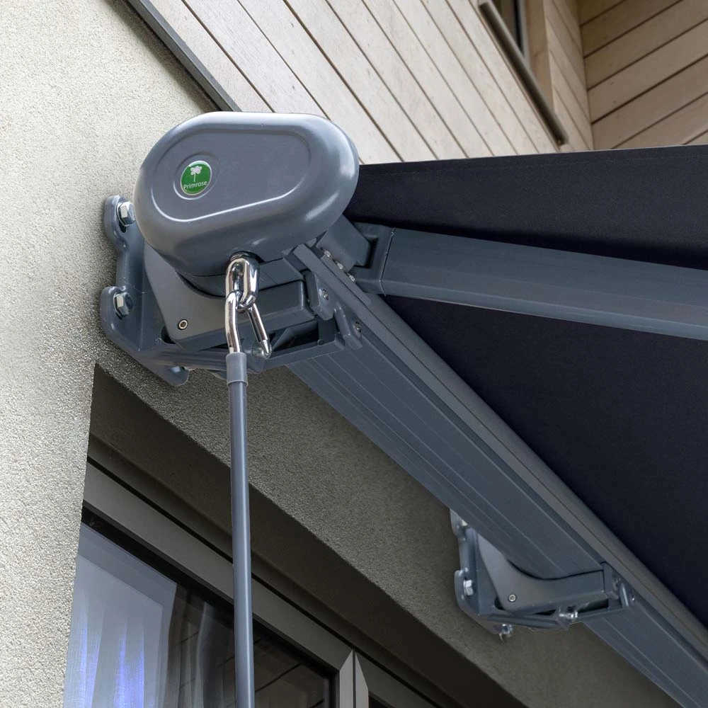 The awning can be opened and closed easily and smoothly using the winding handle on the left hand side (see pictures to the right). It can be opened as much or as little as you like up to the maximum projection. The awning is adjustable to enable you to alter the slope of the awning approximately 15-30 degrees from the horizontal.